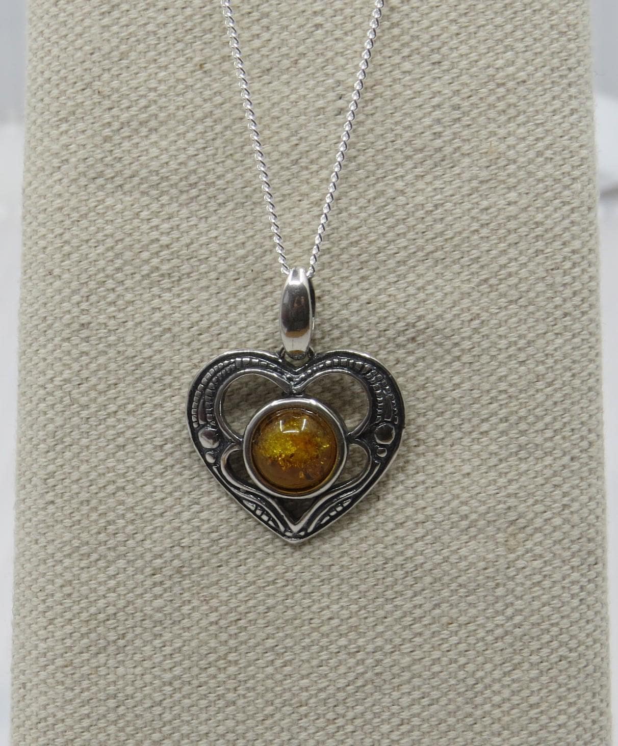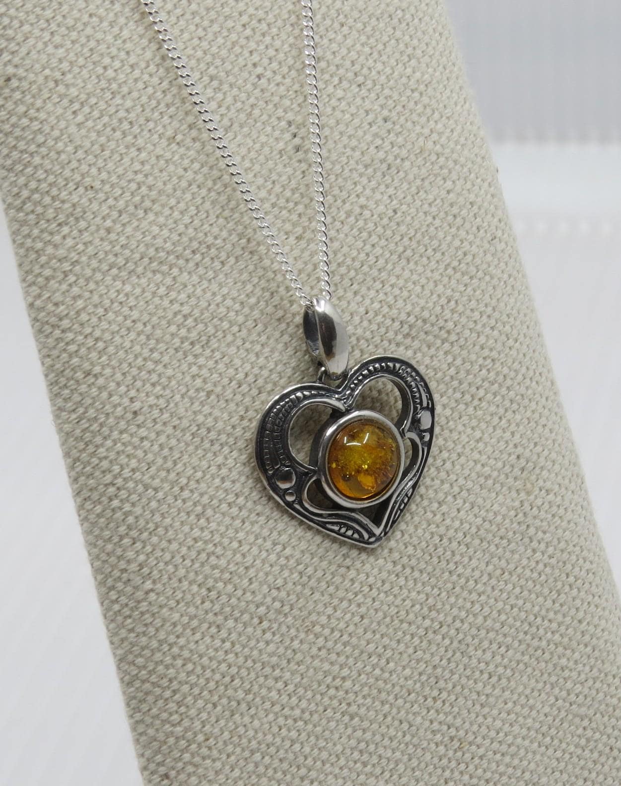 A beautiful handmade Baltic amber heart pendant set in sterling silver